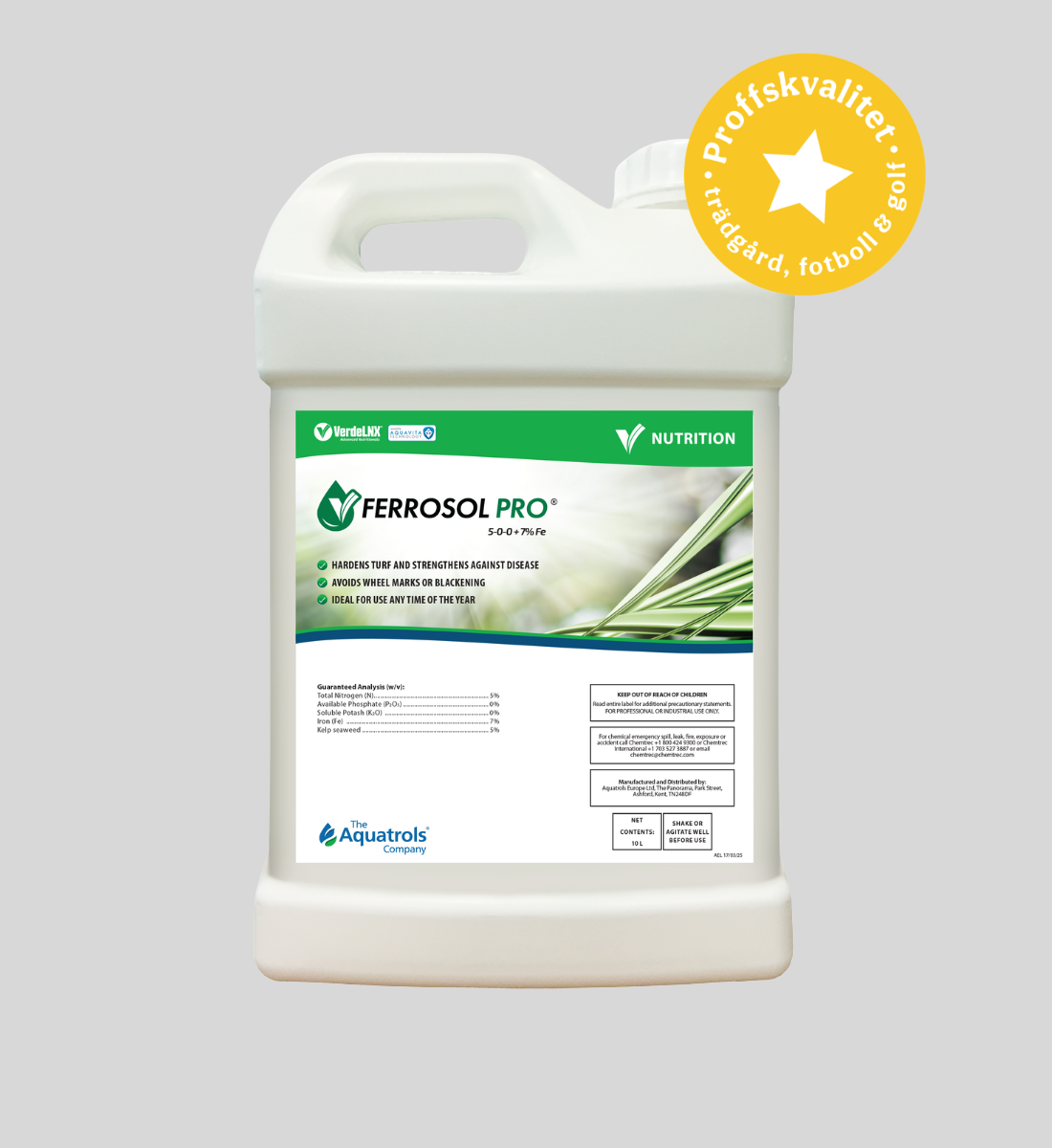 Ferrosol Pro är en högpresterande flytande järnprodukt framtagen för att ge omedelbar grönska och en jämn, frisk gräsyta. Perfekt för sportanläggningar och golfbanor som kräver både snabb visuell effekt och långsiktig hälsa. Med 5 % kväve (N), 7 % järn (Fe) och 5 % kelp (sjögräs) levererar Ferrosol Pro en kraftfull kombination som stärker plantans vitalitet, ökar motståndskraften och ger en djupgrön färg.